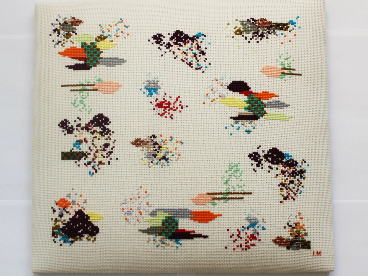 Iliodora Margellos collaborated with Inaash, a charity which provides training in embroidery for refugee women from Palestine, to create variations of her original ‘Stoking Embers’ piece. The floating islets of coloured threads as seen in Margellos’ visual language have been recreated using slightly varied colour schemes for each work. The craftspeople employ the traditional Palestinian cross-stitch, an age-old technique which a number of regions have had their influence on. By combining the two embroidery techniques and cultural narratives into the new pieces, both Margellos’ and Inaash’s aims to stitch stories have coalesced.