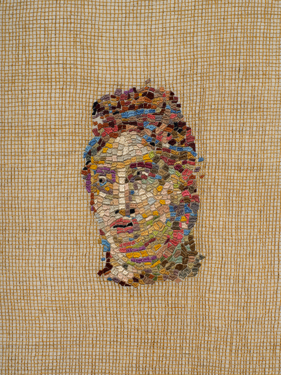 This edition of Untitled, After Gold was created with the distinct Indian embroidery technique, Chamba Rumaal, a 17th-century tradition once practiced by the royal women of Chamba in the Himalayas, where silk threads are stitched onto muslin cloth. The embroidery technique brings a fresh dimension to Paolo Colombo’s lyrical compositions, which draw inspiration from Byzantine and Classical mosaics, further reimagining his signature fusion of ancient and modern influences. Key elements of Colombo’s visual language—the line, dot, and square—are transformed through the medium of thread, offering new interpretations and expanding the dialogue between his meditative practice and the textile tradition.