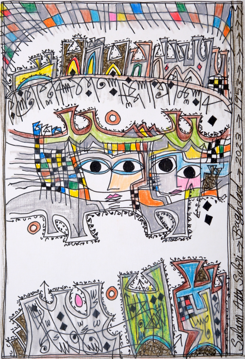 Salam Atta Sabri (b. 1953, Baghdad) is an artist who was based in the USA and Jordan for sixteen years, and in 2005 returned to his homeland, Iraq. His practice, which is primarily fantastical, colourful scenes executed in ink and colour pencils on paper, can be understood as visual diaries of his personal experiences and surroundings. Letters from Baghdad (2005-15) was first shown at the Iraq Pavilion, 56th Venice Biennale. Sabri’s collaboration with the Ruya Foundation led to commissions such as Date Palm Killing Fields series (2016), highlighting the destruction of Iraq’s date palm orchards. Sabri's art intricately weaves together Iraq’s modern art, ancient history, and his own narrative, addressing the nation's conflicts and transformations.