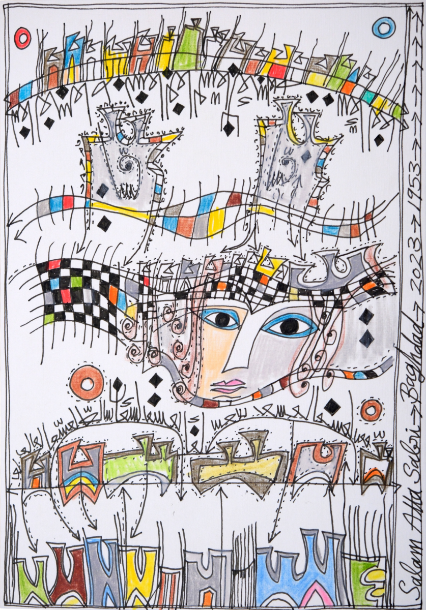 This series of works, completed in Salam Atta Sabri’s signature style, continues to explore landscapes and surroundings that inspire him. Often abstracted yet incorporating figurative elements such as faces and palms, Atta Sabri depicts fantastical scenes brimming with vibrant colours. Each piece showcases a varying density of ink lines and shapes, maintaining a consistent grid-like structure. Atta Sabri has established a signature geometric style featuring circles, semicircles, squares, rectangles, triangles, lines and undulating forms. The influence of Paul Klee, an artist introduced to Salam by his father, is also evident.